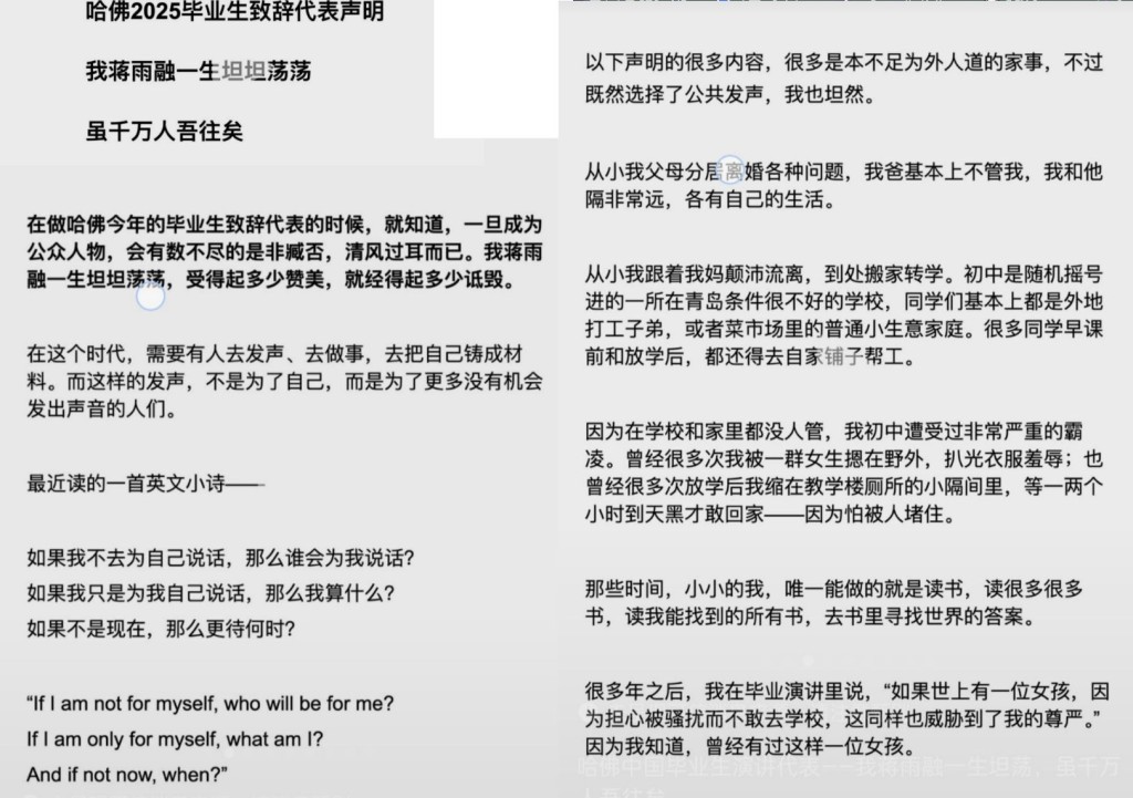 哈佛畢業致詞|蔣雨融陷“走后門”爭議,發文澄清自揭成長傷痕