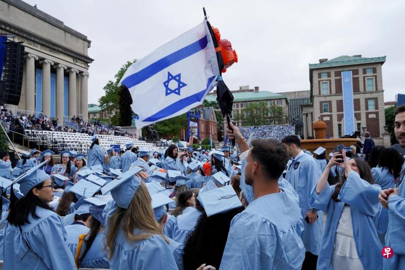▲今年5月21日,美國紐約市曼哈頓哥倫比亞大學主校區畢業典禮上,一名學生手持以色列國旗。路透社