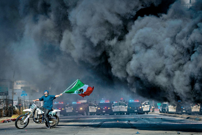 ▲洛杉磯一名示威者上周六騎電單車揮舞墨西哥國旗,附近有一架汽車焚燒,冒出大量濃煙。