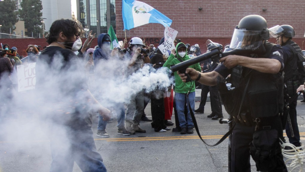 洛杉磯防暴警察向示威者發射非致命武器。