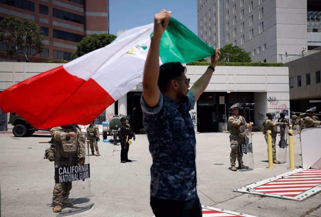 1名男子10 日高舉墨西哥國旗,在洛杉磯市中心的加州國民警衛隊成員面前抗議。路透社