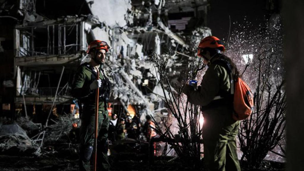 ▲伊朗13日晚報復以色列,發動導彈攻擊,救援與安全人員在以色列拉馬甘市(Ramat Gan)執行任務。(路透)