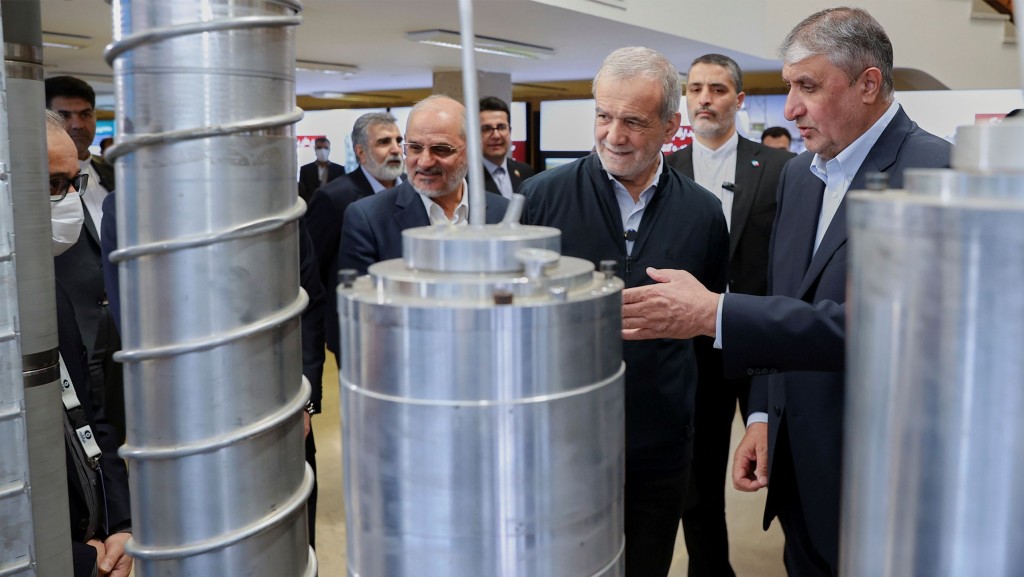 伊朗總統佩澤什基安在伊朗德黑蘭參觀伊朗核成就展覽。 美聯社