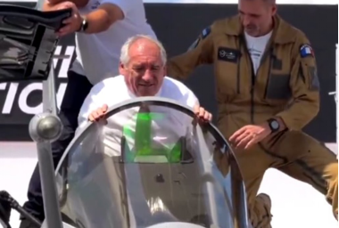 ▲貝魯近日在巴黎航展期間登上“陣風”戰斗機,卻意外被卡駕駛艙無法自行脫身。圖源:外媒報道配圖