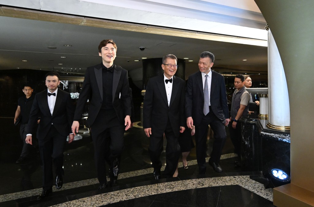 財政司司長陳茂波(中)在星島新聞集團主席郭英成(右)、星島新聞集團主席蔡加讚(左)陪同下進入會場。