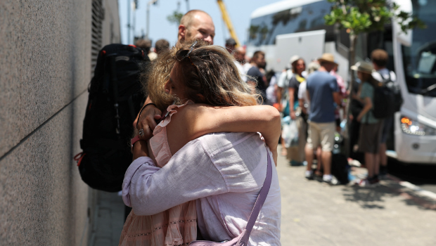 ▲2025年6月17日,以色列民眾擁抱,自特拉維夫搭乘巴士前往埃及。(路透社)