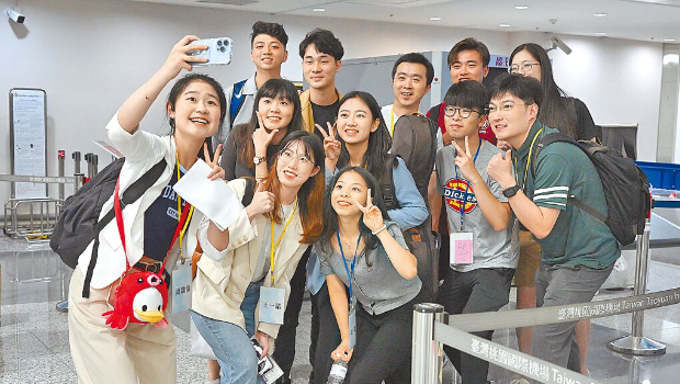▲馬英九基金會邀請的陸生團訪臺,結束行程離臺,兩岸學生在機場合影留念。中時