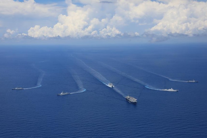 今早,在航行期間,官兵在山東艦航空母艦飛行甲板上,列隊排成“國安家好”字樣。