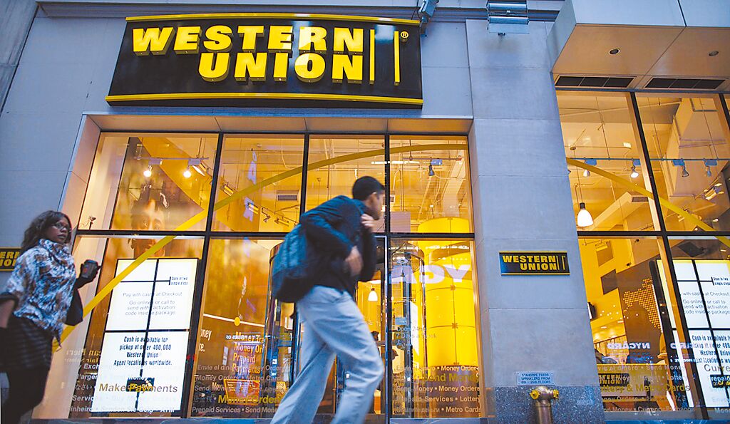 ▲圖為人們走過紐約時代廣場的西聯匯款分行。(路透)