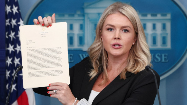 白宮發言人萊維特在記者會上展示美國總統特朗普致日本首相石破茂的信件。