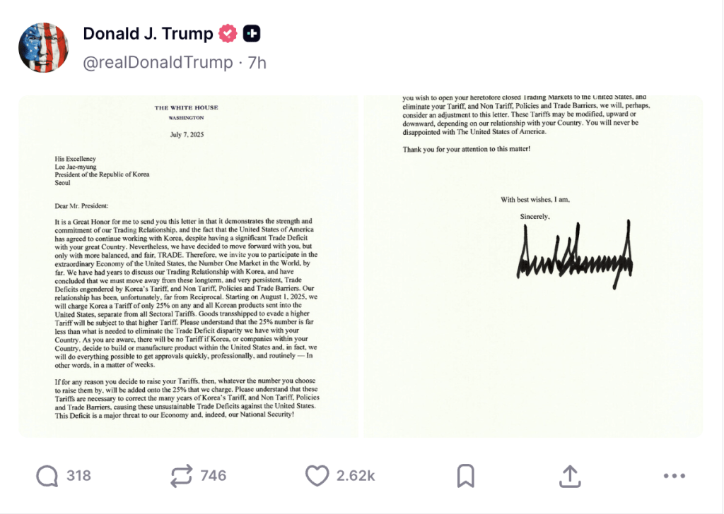 特朗普在其社交平臺 Truth Social 上發布致日本首相石破茂與韓國總統李在明的信函,正式通知關稅將于下月生效。他在信中表示:“如果你們出于任何原因決定提高關稅,那么無論你們選擇提高多少,都將在我們征收的25%關稅基礎上加征關稅?!?/p>