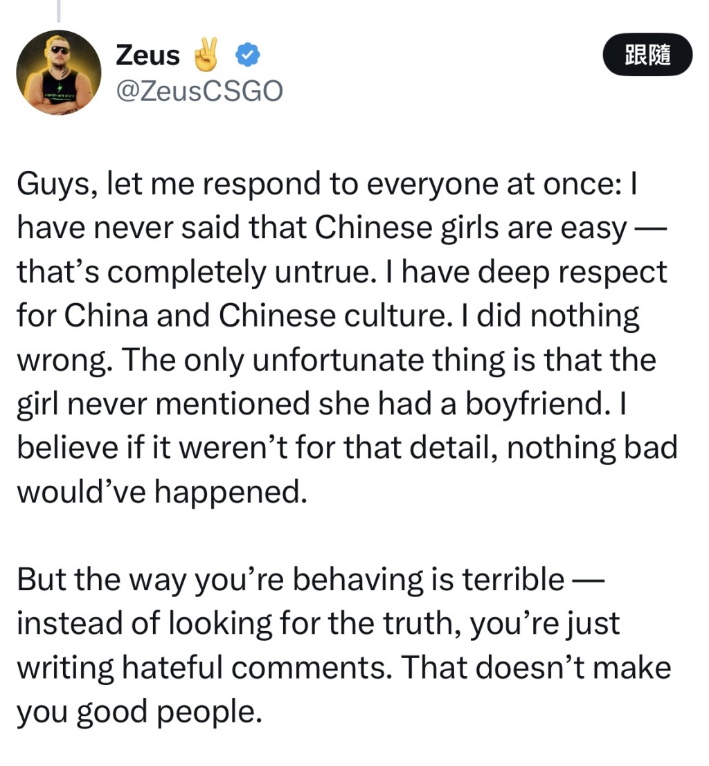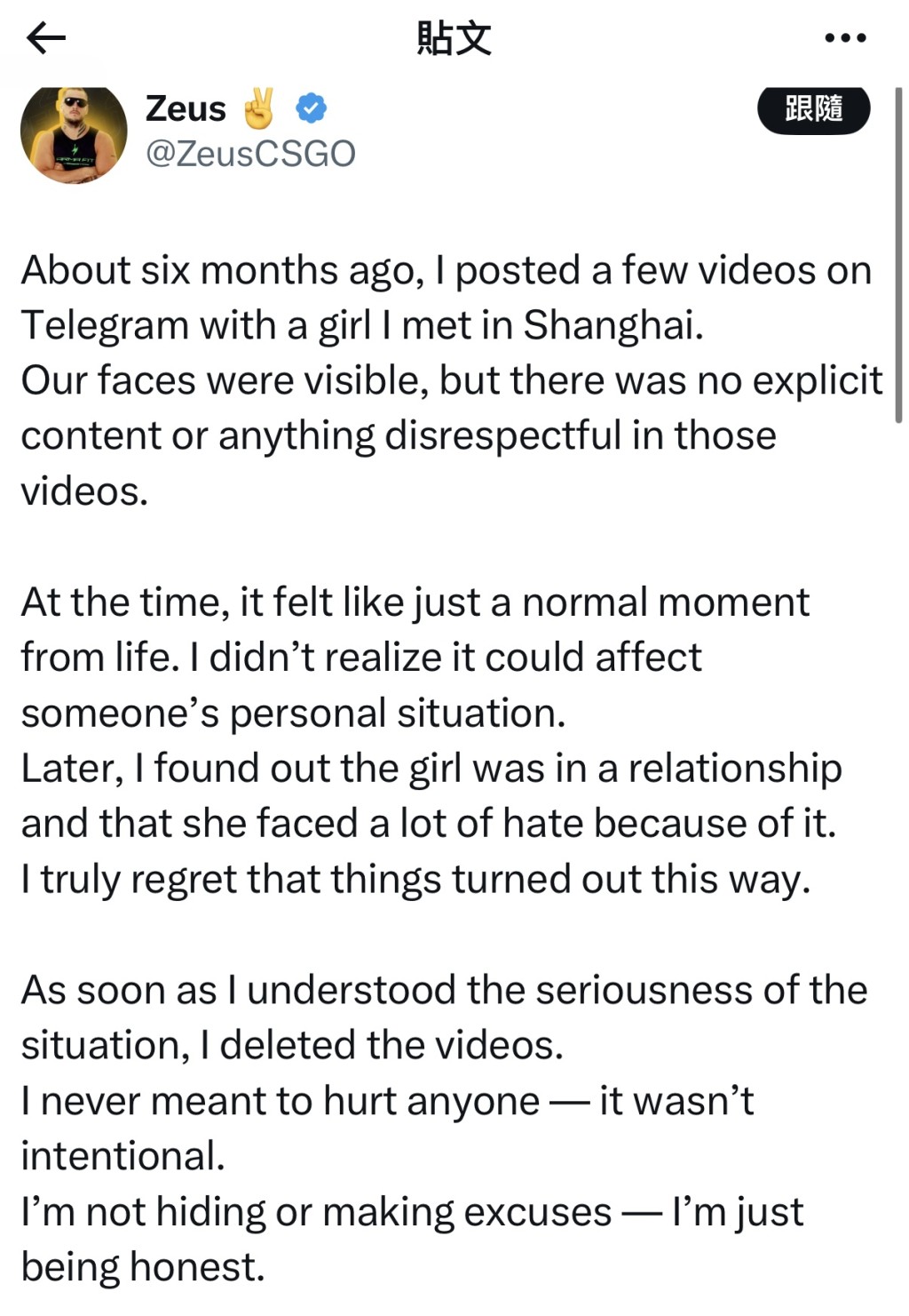 宙斯發文辯稱,視頻無露骨內容,自己單身無子女。 X@ZenusCSGO3
