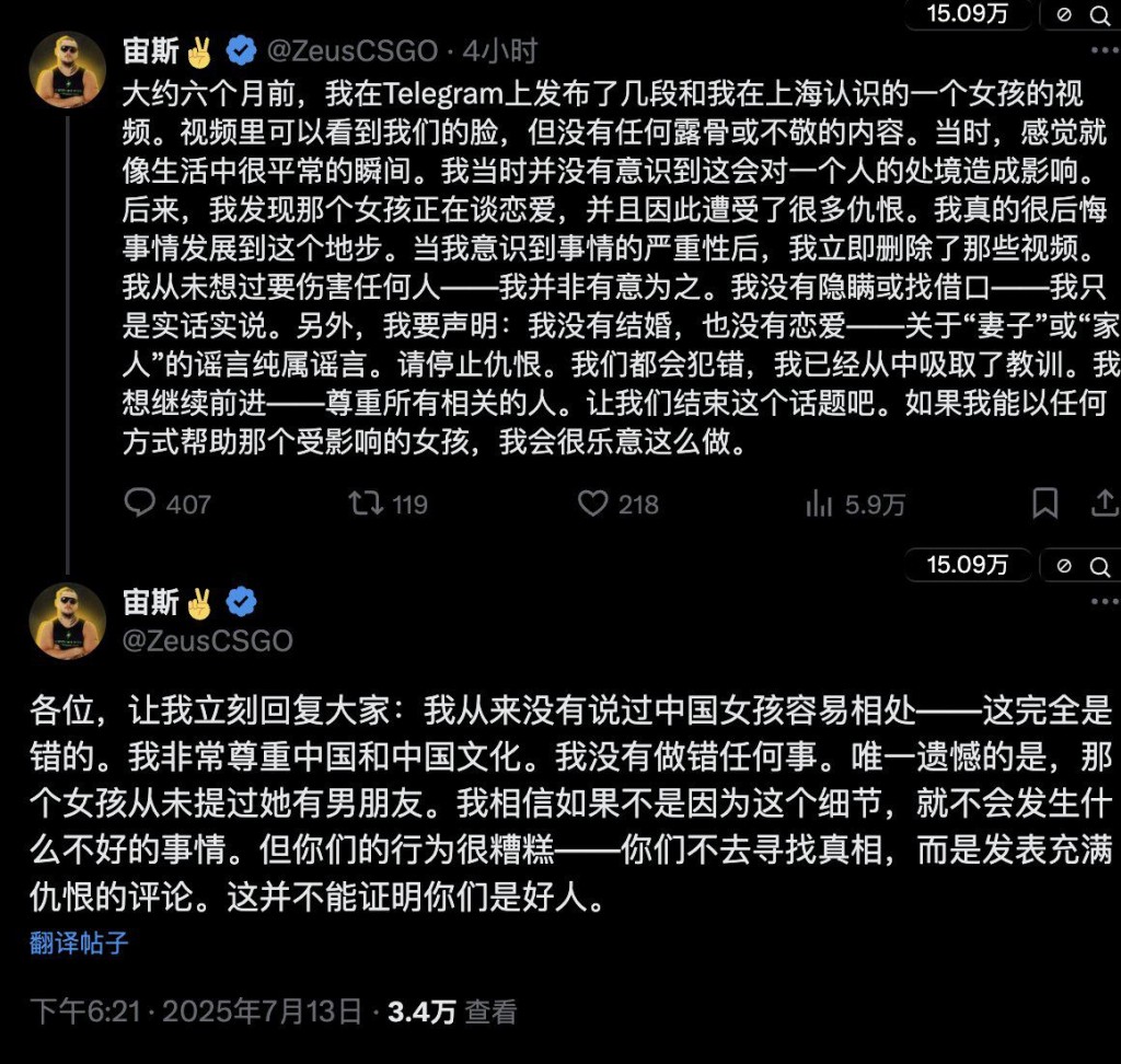 烏克蘭知名電競選手Zeus(宙斯)去年底在粉絲群曬出在華期間與中國女生的私密視頻,受到關注。網傳雙方當時均非單身(女方有男友,宙斯被曝已婚已育)。大連工業大學近日以“不當行為”“有損國格”為由,公布涉事女生全名,開除她的學籍。相關話題沖上微博熱搜,引發爭議。宙斯今(14日)發文辯稱,視頻無露骨內容,稱自己單身無子女,而女方隱瞞有男友。