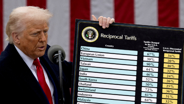 2025年4月2日,美國總統特朗普在白宮發表對等關稅稅率時留影。