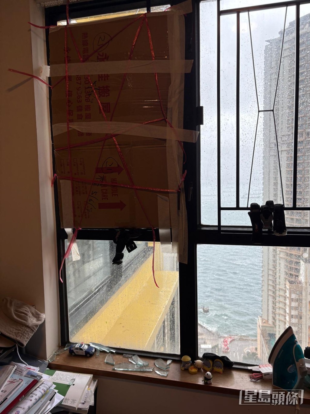 ▲堅尼地城有市民家中玻璃窗在強風下破裂。讀者提供