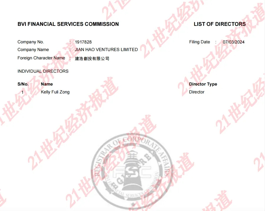 據21世紀經濟報道,7月21日,記者從英屬維京群島金融服務委員會查詢得知,娃哈哈爭產案第二被告Jian Hao Ventures Limited(建昊企業有限公司)的唯一董事為宗馥莉。該決議及同意任職書最后存檔的日期為2024年3月7日。
