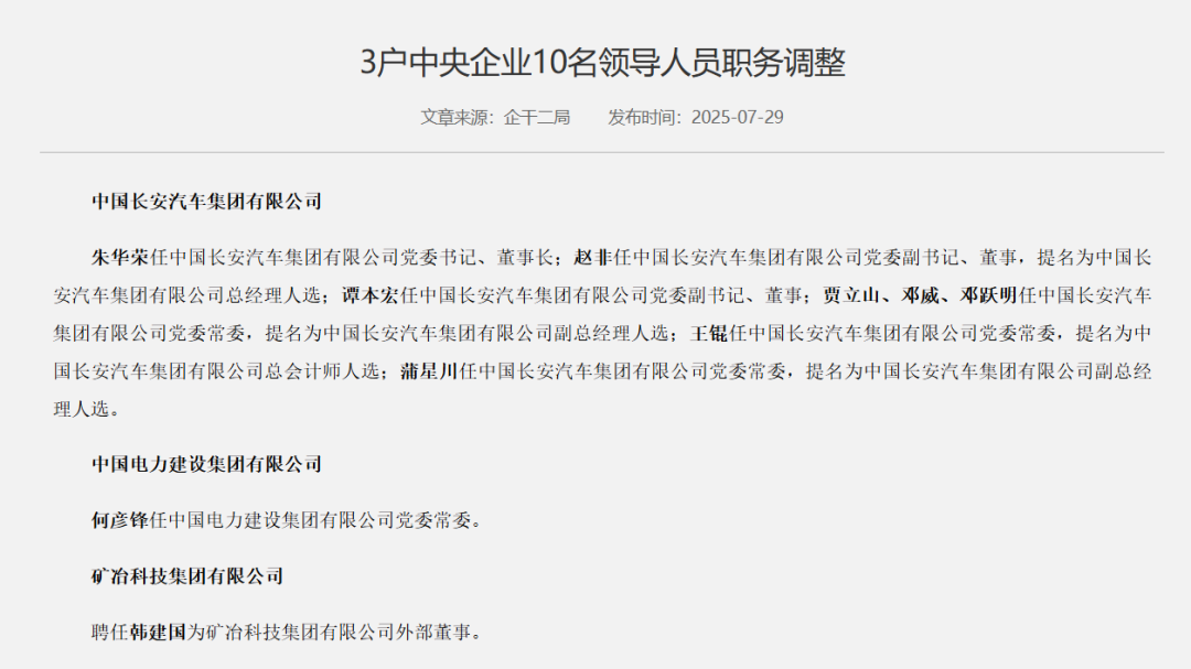 7月29日,國務院國資委網站中央企業名錄更新,中國長安汽車集團有限公司入列排序第73位,這也是由國務院國資委直接管理的第100家央企。同時,國務院國資委發布3戶中央企業10名領導人員職務調整公告,朱華榮出任中國長安汽車集團有限公司黨委書記、董事長。相關鏈接:中國長安汽車集團將于7月30日宣告成立