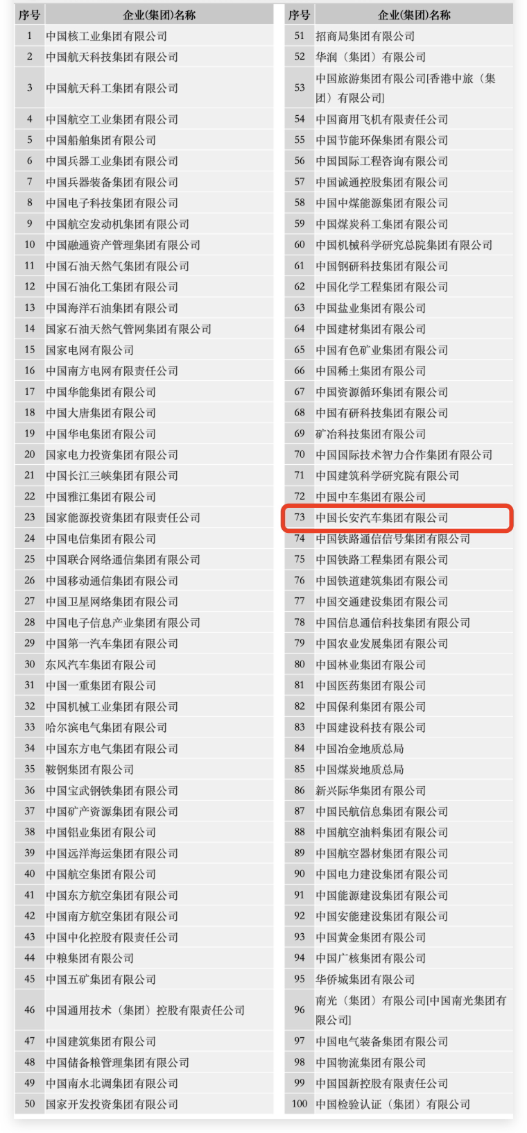 在國務院國資委發布的最新央企名錄中,中國長安汽車集團的序號為73,這也是由國務院國資委直接管理的第100家央企。