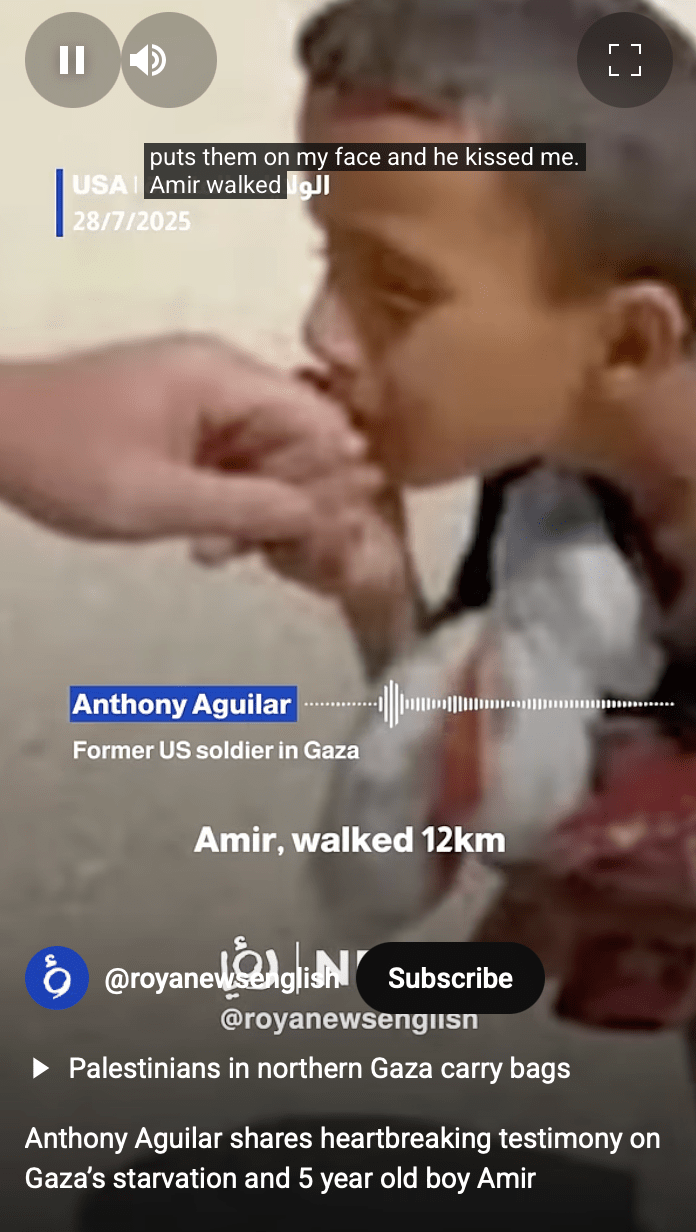 美國退伍軍人阿吉拉(Anthony Aguilar)在最近的采訪中稱,親眼目擊以軍在加沙食物分發點射殺平民。他憶述,一名名為阿米爾(Amir)的男孩在加沙徒步12公里到達由加沙人道主義基金會(GHF)設定的援助分發點,領取少量食物后,卻在片刻間被以色列軍隊開槍打死。阿吉拉曾是GHF的承包商,稱要向全球警示這一由美國和以色列支持的援助計劃。