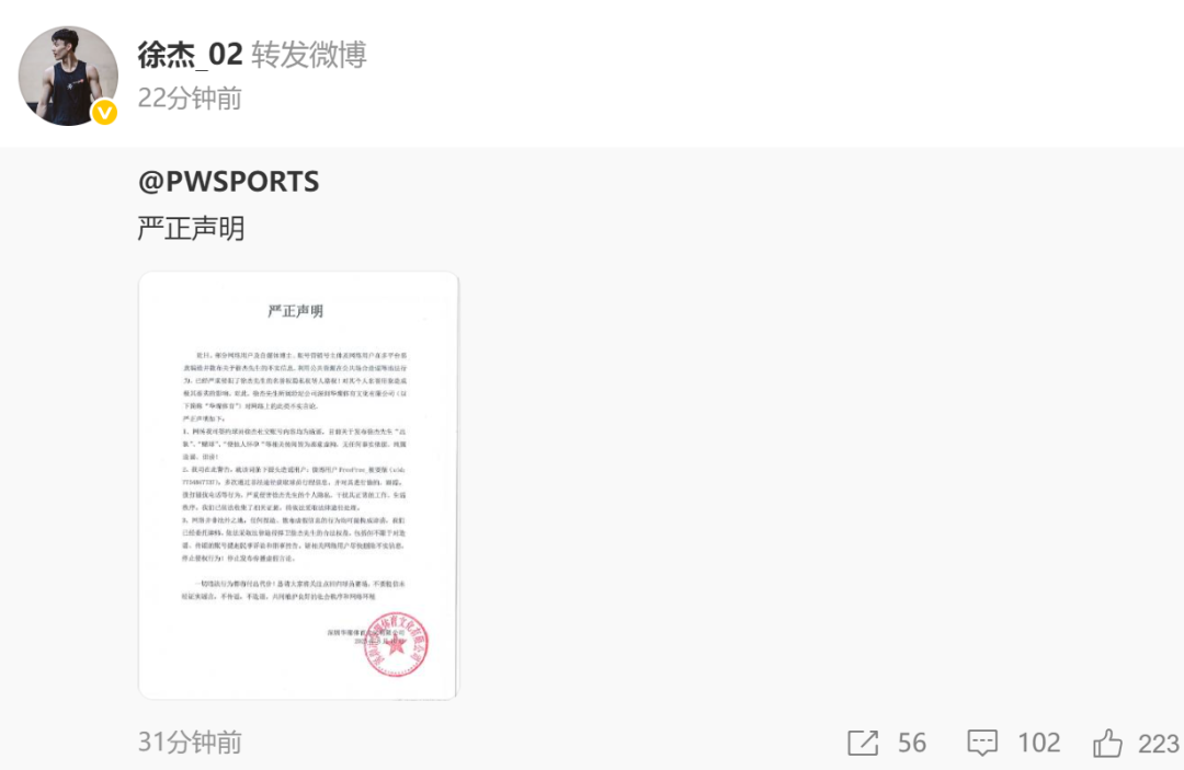 10日中午,@PWSPORTS 發布聲明稱,網傳內容均為造謠,相關傳聞為惡意虛構,無事實依據,屬于造謠誹謗。此后,徐杰@徐杰_02 轉發了該則聲明。