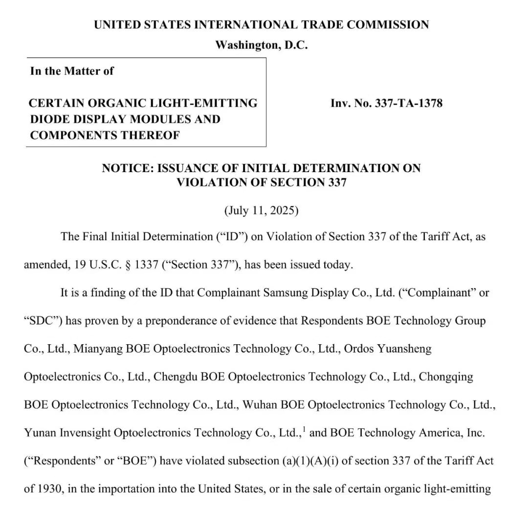 2022年12月,三星顯示首次向 ITC 起訴京東方侵犯4項OLED專利。2023年初,新增 ITC 商業秘密侵權調查及德州法院專利訴訟。同年10月,三星顯示向ITC提出本次初裁相關的侵權申訴,直指京東方 "挖角員工、竊取技術資料",將矛盾推向頂點。