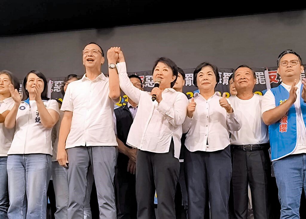 ▲臺中市長盧秀燕(前排左三)17日在臺中反惡罷助講時,拉起國民黨主席朱立倫(左二)的手,說朱這幾年表現有目共睹,要給他拍拍手,“媽媽給你按個贊”。