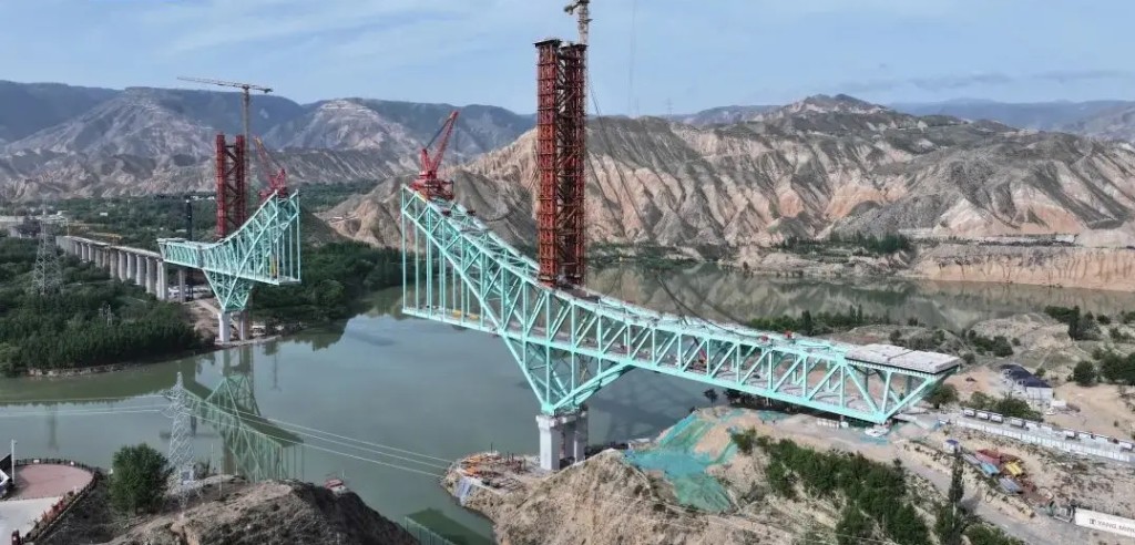 ▲施工中的尖扎黃河特大橋。 央視截圖