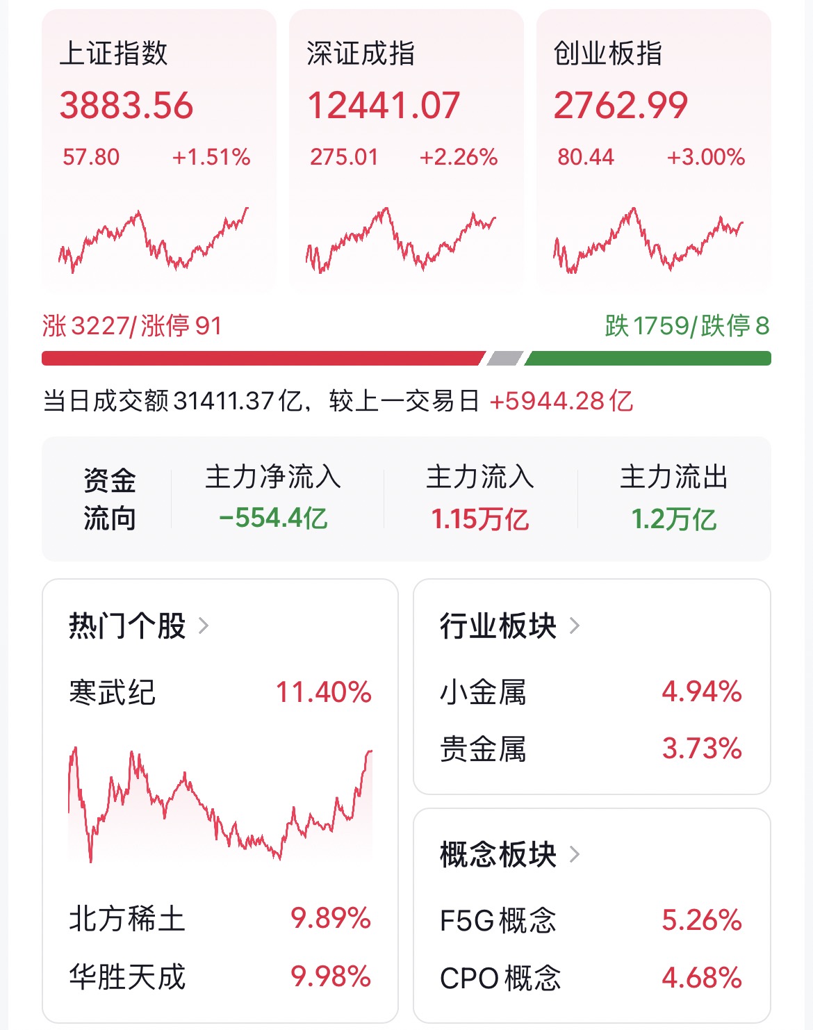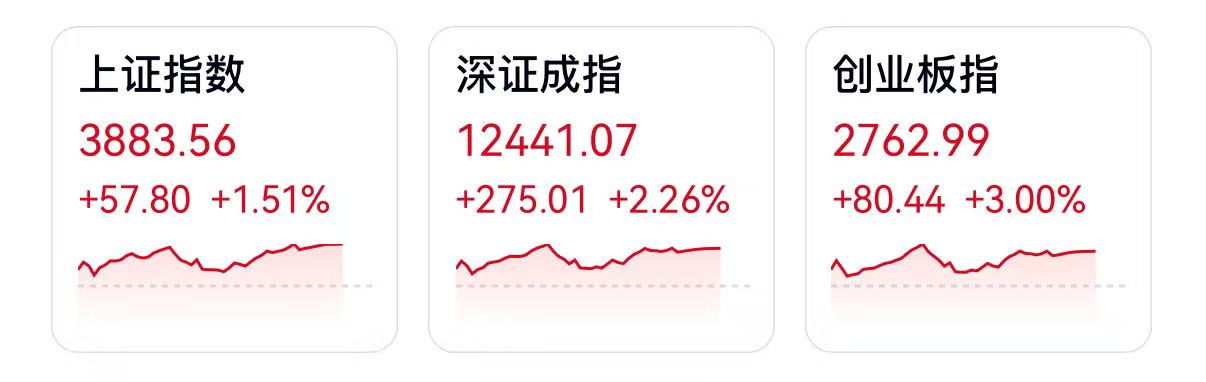 截至收盤,滬指報3883.56點,漲1.51%;深成指報12441.07點,漲2.26%;創指報2762.99點,漲3.00%。盤面上,稀土永磁、白酒板塊、F5G概念漲幅居前,賽馬概念、共享單車、芬太尼板塊跌幅居前。