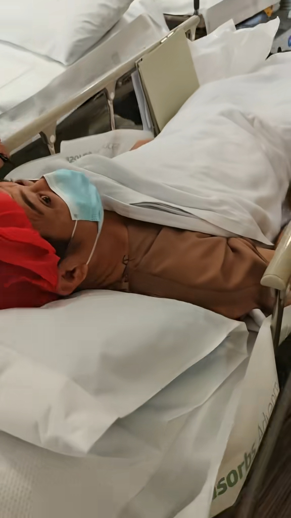 李連杰躺在病床雙眼緊閉,露出痛苦神情。