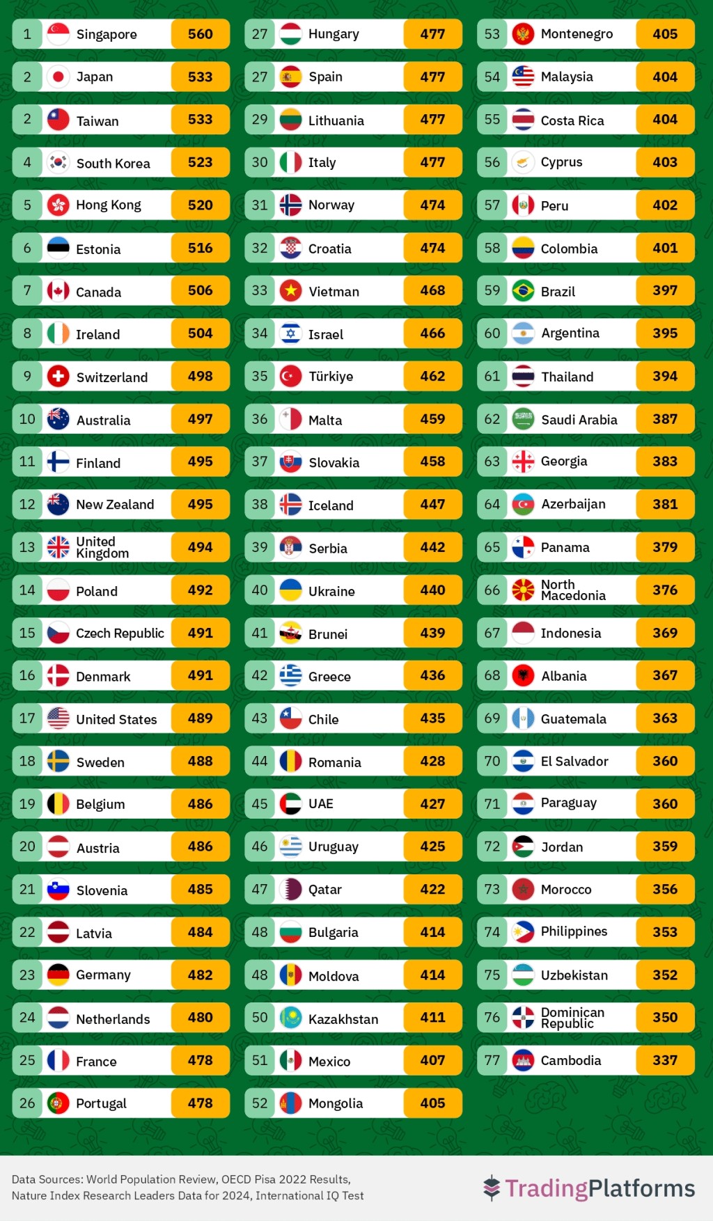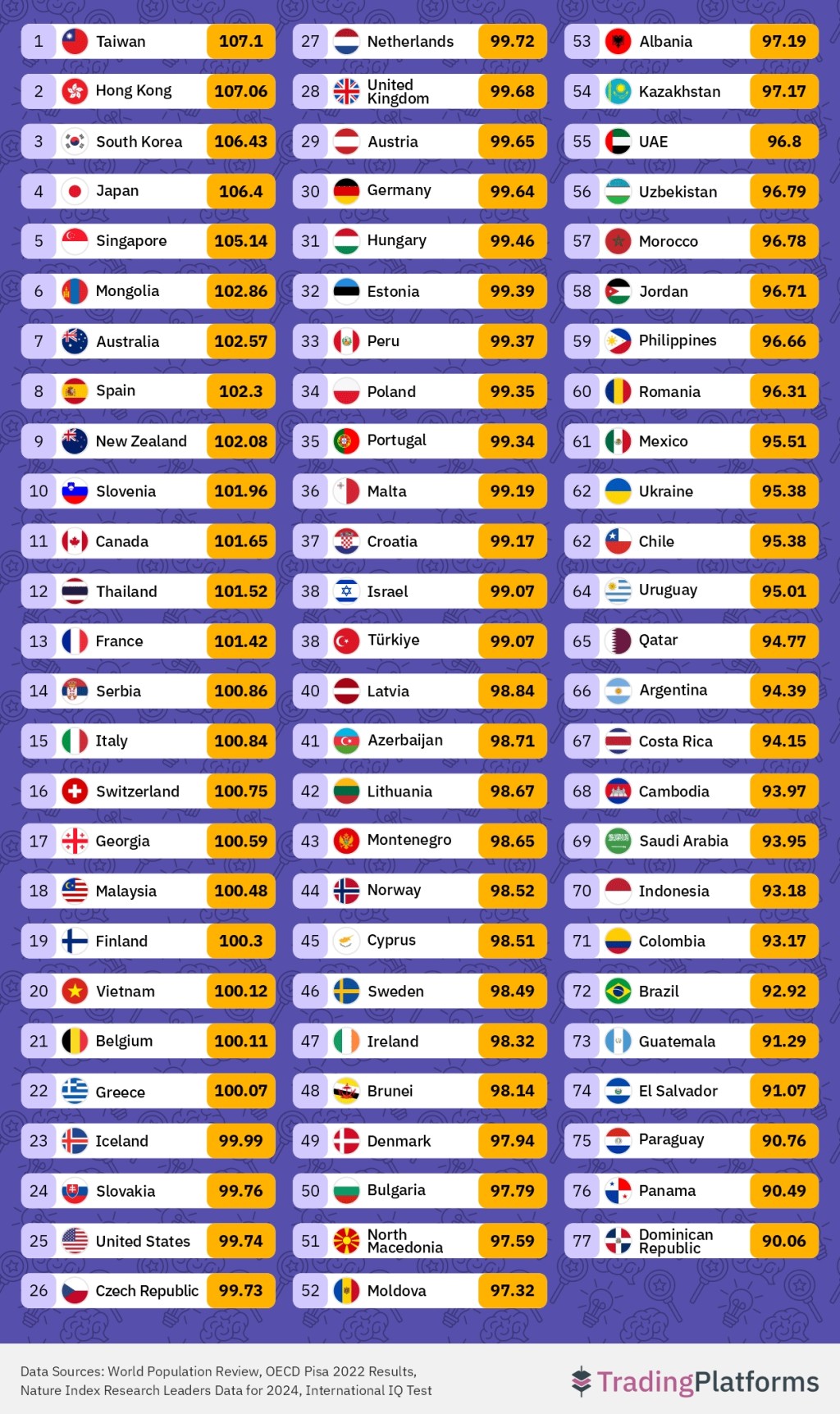 臺灣總得分為66.3分,平均智商高達107.1分,在2022年PISA評估中位數得分533分,超過香港的520得分,使得總排名位居第四。