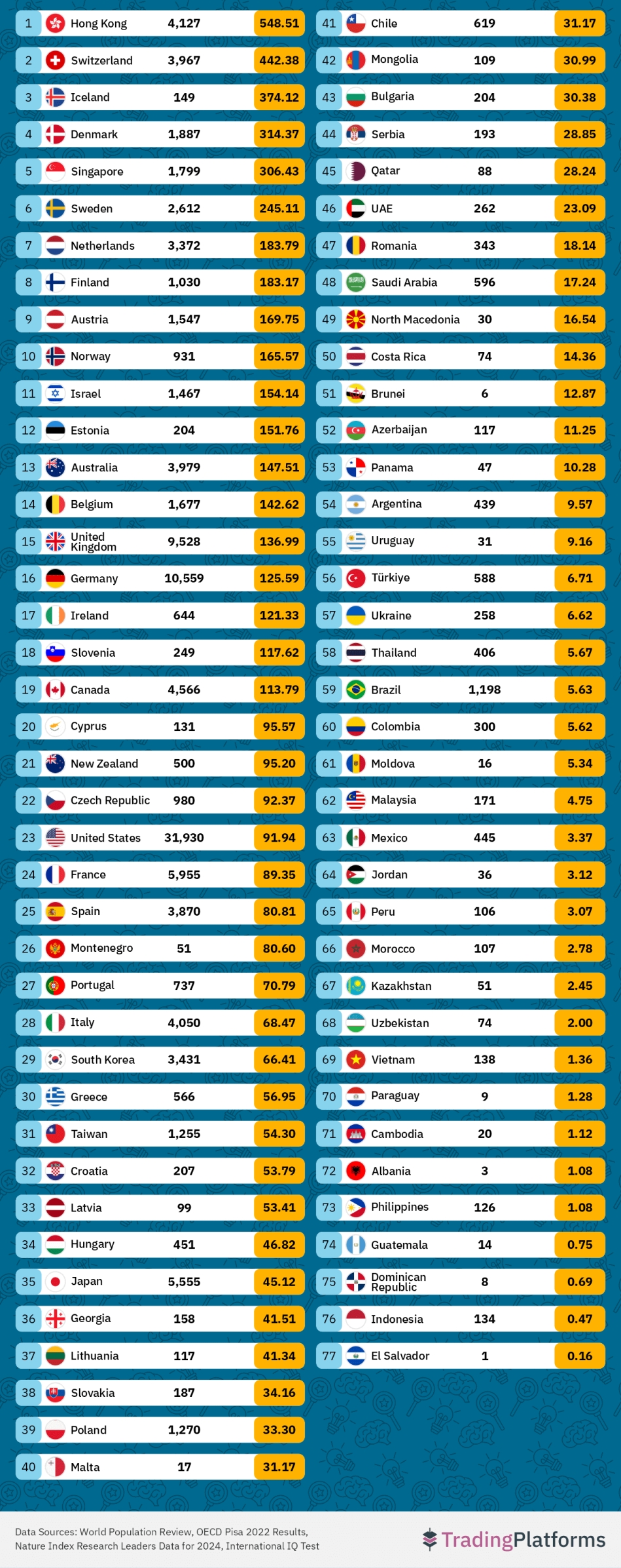 基于這些因素,香港學生以接近滿分的94分,位居全球最聰明榜單冠軍,其科學研究產出領先全球,平均每百萬居民發表548.5篇科學論文。