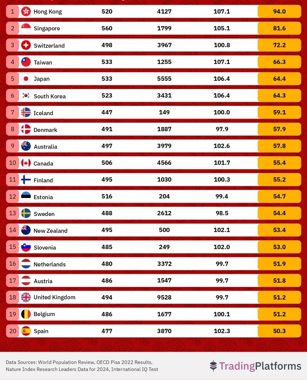 正值新學年即將開始之際,總部位于英國的線上平臺TradingPlatforms于周五(29日)發布了其2025年全球最聰明國家或地區排名。香港以94分(滿分100分)的智商評分位居全球榜首,科學研究成果數量也位居世界首位,每百萬居民平均發表548.5篇科學研究論文。臺灣人的平均智商為107.1,居世界之冠,香港人平均智商為107.06緊隨其后。未知是否因大陸排名較后,還是未被列入統計范圍,排名成績單未有列出大陸的排名。