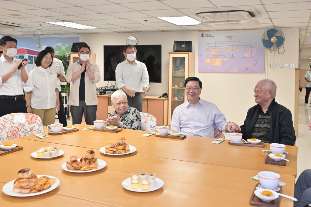▲李家超參觀社會服務大樓,期間與一名106歲伯伯(右)談起打麻將心得。政府新聞處