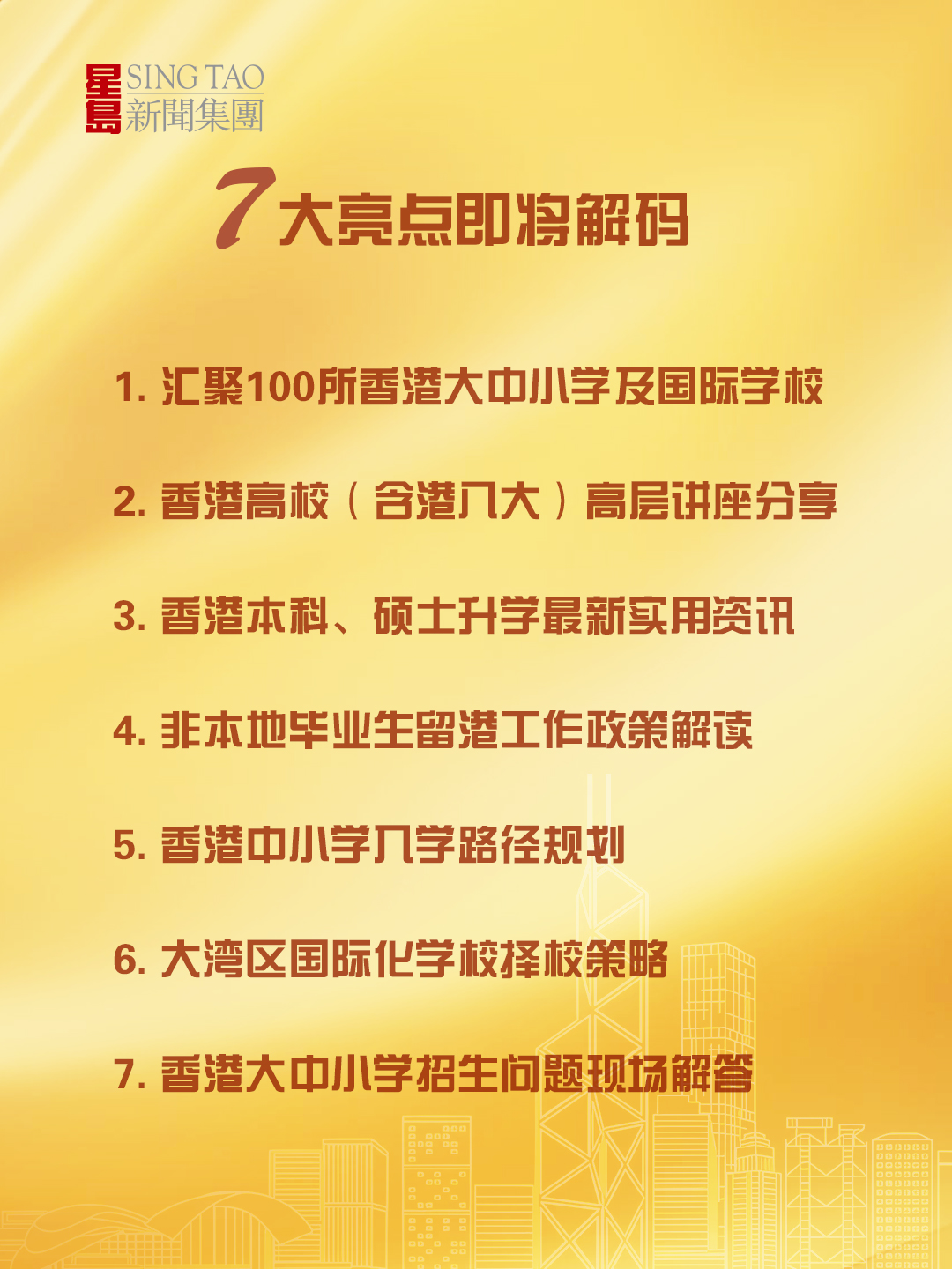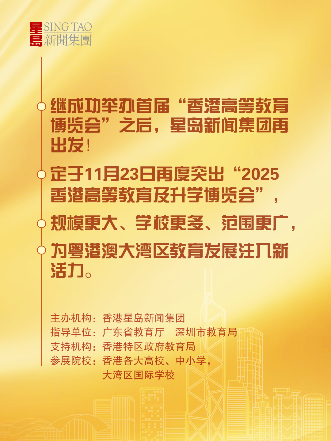 你是否懷揣著留學香港、追逐夢想的渴望?你是否正為孩子尋找優質教育資源?你是否正在為教育“內卷”而焦慮?別擔心,2025 年 11 月 23 日,由星島新聞集團主辦、專為大灣區學生及家長打造的教育盛宴——“香港高等教育及升學博覽會”將在深圳會展中心(福田)5號館盛大啟幕。