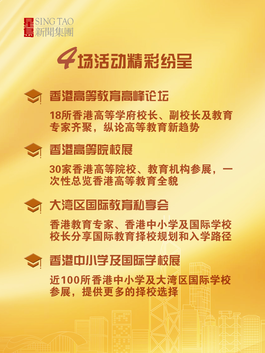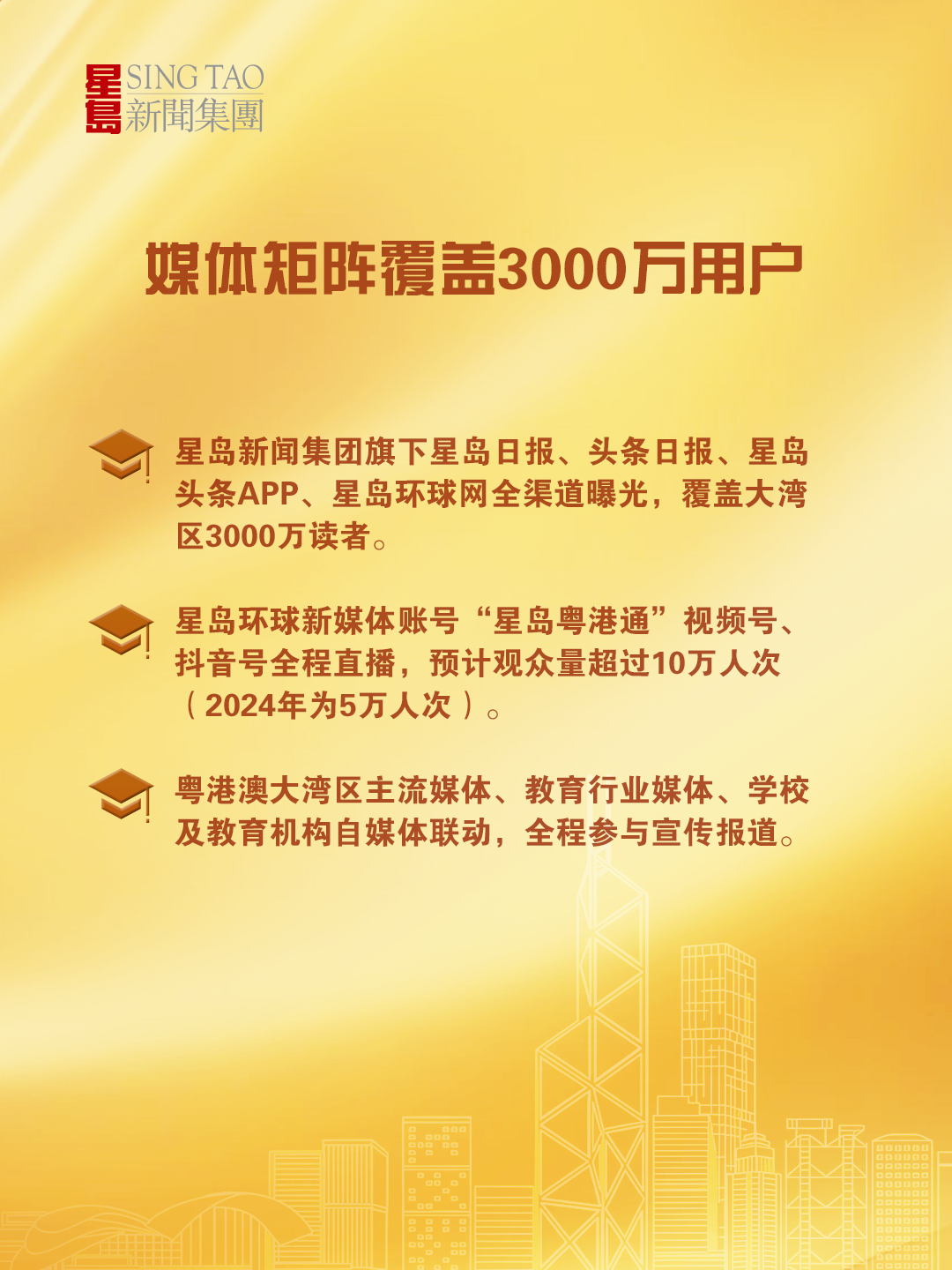 香港星島新聞集團2024年在中聯辦、廣東省教育廳、香港特區政府教育局、深圳市教育局的大力支持下,成功舉辦了“首屆香港高等教育博覽會”,吸引了近6萬名學生和家長線下、線上熱情參與,博覽會贏得香港特首李家超的嘉許,以及粵港兩地教育界的廣泛好評。2025年,星島再度發揮其媒體優勢,回應社會各界殷切期盼,為粵港澳大灣區教育領域帶來這場知識與機遇交融的盛宴。
