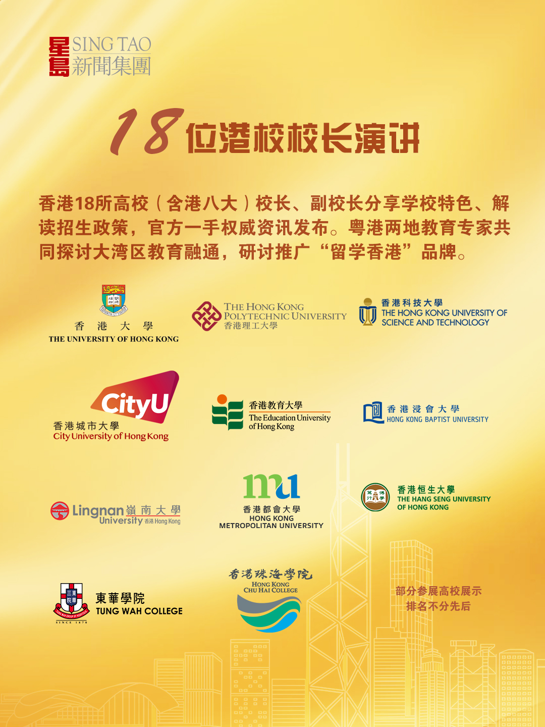 香港特區政府教育局、廣東省教育廳、深圳教育局領導和專家,將共同探討粵港教育融通、“留學香港”品牌打造等熱門話題。香港勞福局官員將現場解讀“非本地生留港就業政策”,為留學之后順利留港就業做好準備。在這里,你能第一時間掌握香港教育最新動態,為學業規劃、升學決策提供權威參考 。