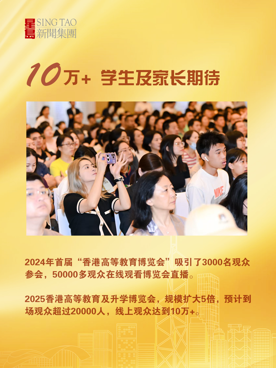 2024年首屆香港高等教育博覽會,吸引了3000多位家長和學生到場,更有超過5萬觀眾在直播間,與港校校長們互動。今年博覽會規模擴大,預計將有2萬觀眾將來到博覽會現場,超過10萬人通過直播全程觀看校長們的精彩發言,并通過直播間提問、互動。