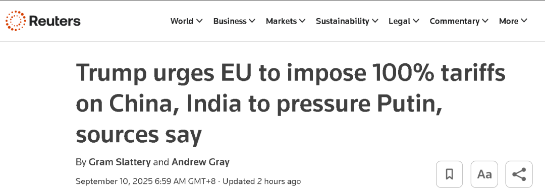據英國《金融時報》和路透社披露,當地時間周二,在美國與歐盟的高級官員在華盛頓舉行的一場意在通過極限施壓俄羅斯結束俄烏沖突的會議上,美國總統特朗普提出了一個超乎尋常的要求:他想讓歐盟對購買俄羅斯能源的印度和中國這兩個大國都加征100%的關稅,以施壓俄羅斯盡快結束俄烏沖突。