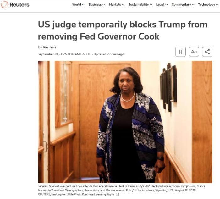 目前,美聯儲表示庫克仍在任職。路透社稱,此案很可能最終會上訴至美國最高法院。