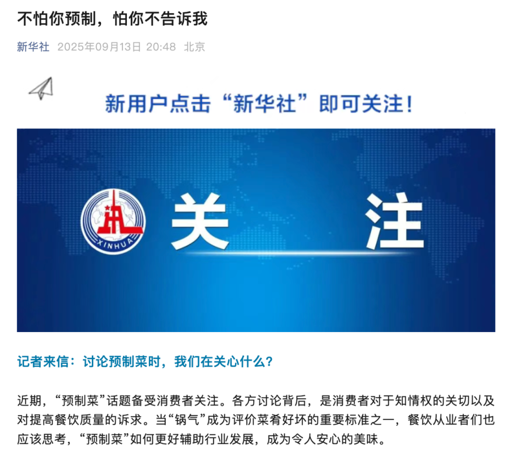 9月13日晚間,新華社發布文章《不怕你預制,怕你不告訴我》。文章認為,各方討論背后,是消費者對于知情權的關切以及對提高餐飲質量的訴求。當“鍋氣”成為評價菜肴好壞的重要標準之一,餐飲從業者們也應該思考,“預制菜”如何更好輔助行業發展,成為令人安心的美味。