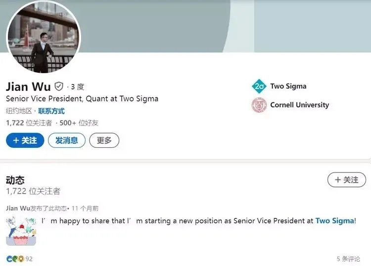 據悉,吳艦在2011年取得了清華大學的工學學士學位,并于2017年從美國康奈爾大學獲得了哲學博士學位,曾在知名投資機構Citadel實習,2018年進入量化基金巨頭Two Sigma任職,三年內火速升任副總裁。2023年1月,工作不到5年的吳艦更被提拔為高級副總裁。(Two Sigma為全球最具規模的量化對沖基金之一,長期以數學模型與演算法驅動投資決策。)