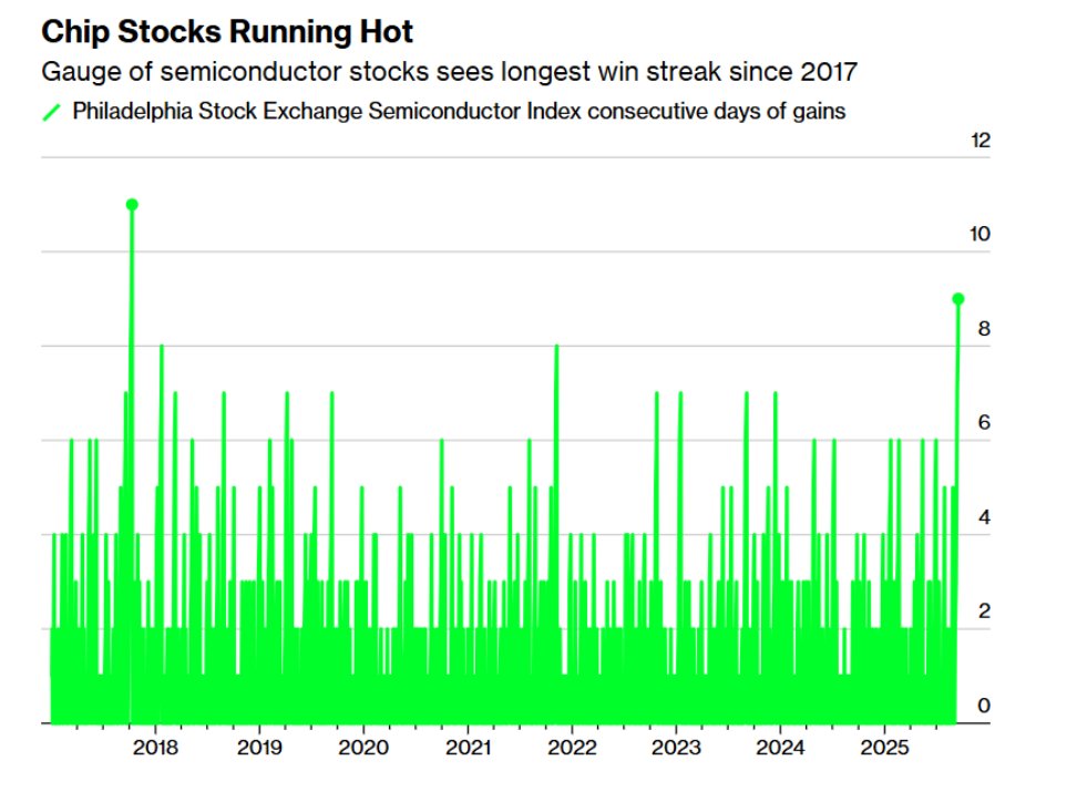 費城半導體指數除了在周三小幅下跌,近期可謂持續吸引全球資金進而持續上漲且屢創新高。自2023年以來的這輪“美股長期牛市”的核心驅動力之一——芯片股自4月低點以來可謂漲勢如虹,該板塊甚至實現近八年來持續時間最長的連續上漲行情。截至本周二,費城半導體指數實現連續九個交易日上漲,創下自2017年以來持續時間最長的連漲,該指數在這九個交易日期間累計上漲8.7%,年內漲幅則高達26%,大幅跑贏同期漲幅接近16%的納斯達克100指數。