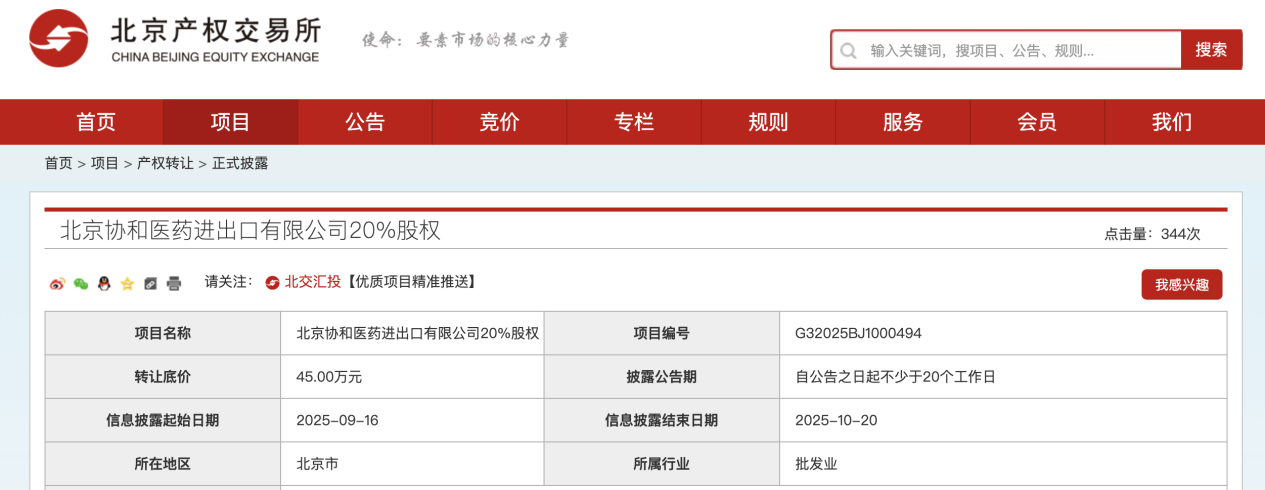 9月16日,中藝鑫融資產管理有限公司掛牌轉讓北京協和醫藥進出口有限公司20%股權,轉讓底價為45.00萬元,信息披露結束日期為2025-10-20。