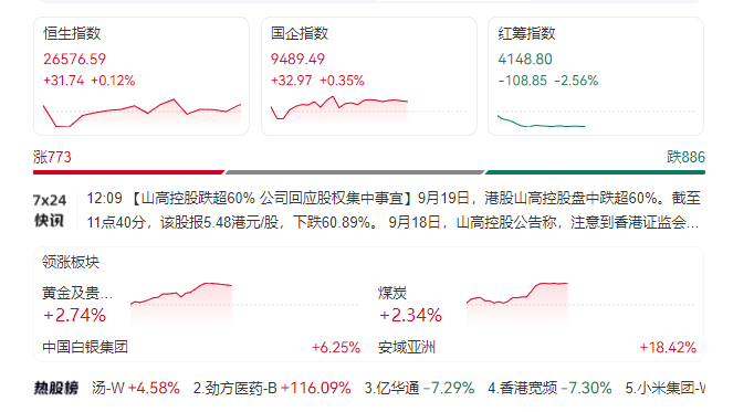 9月19日消息,港股三大指數集體上漲。截至午間收盤,恒生指數漲0.12%,報26576.59點,恒生科技指數漲0.62%,國企指數漲0.35%。盤面上,科網股漲多跌少,京東漲超3%,聯想漲超2%,阿里巴巴漲超1%,網易跌超1%;博彩股普漲,永利澳門漲超5%;有色金屬板塊走強,贛鋒鋰業漲超10%;黃金股拉升,山東黃金漲超5%;創新藥概念走弱,信達生物跌超4%;勁方醫藥上市首日漲超116%。