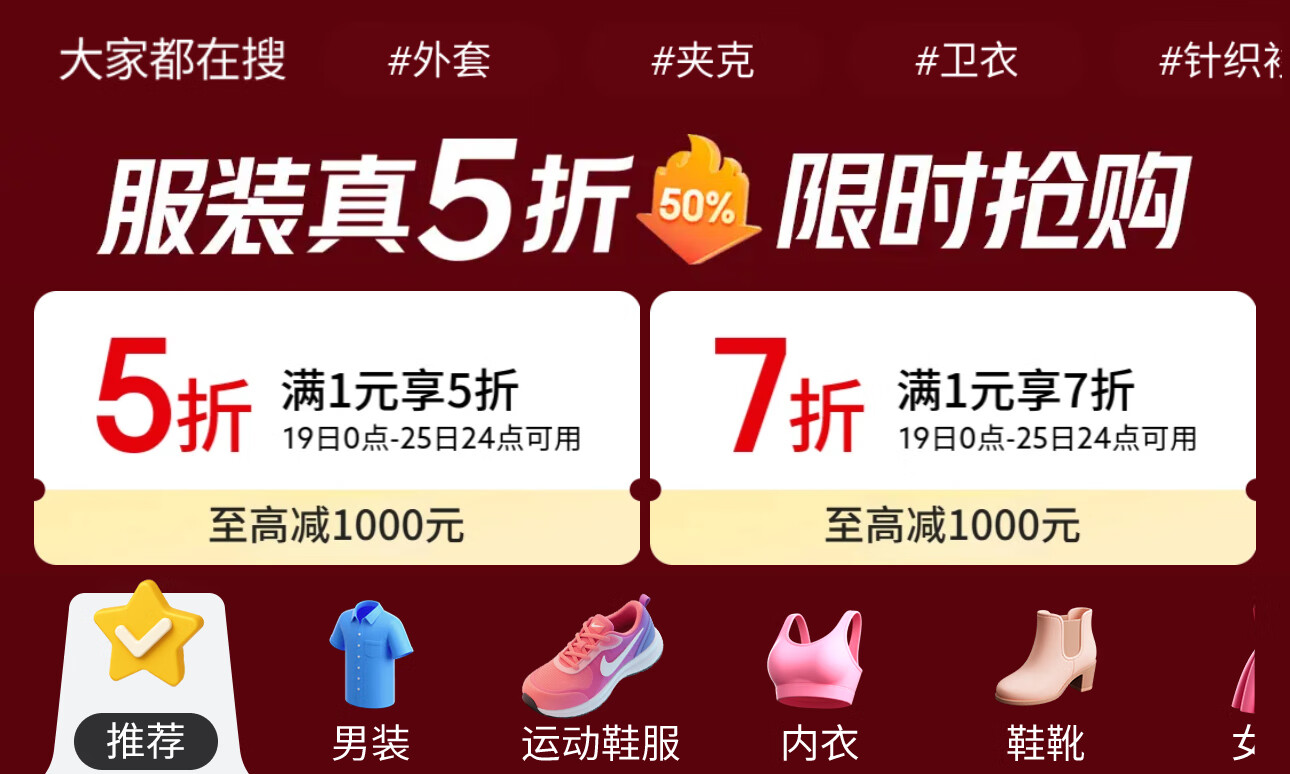今年的“服裝真5折”活動在去年基礎上全面升級,帶來更豐富的品牌陣容、更大的優惠力度與更簡單的參與方式?;顒哟笈圃萍?,匯聚了耐克、阿迪達斯、THE NORTH FACE、海瀾之家、ONLY、蕉內、ubras、斯凱奇、巴拉巴拉等眾多國內外知名品牌,覆蓋服飾全品類,新品與爆款數量大幅增加;在優惠方面,本次活動滿1元即享5折,至高立減1000元,參與方式也十分簡單,新老用戶均可進入會場一鍵領取五折券,享受直接、透明的購物體驗。