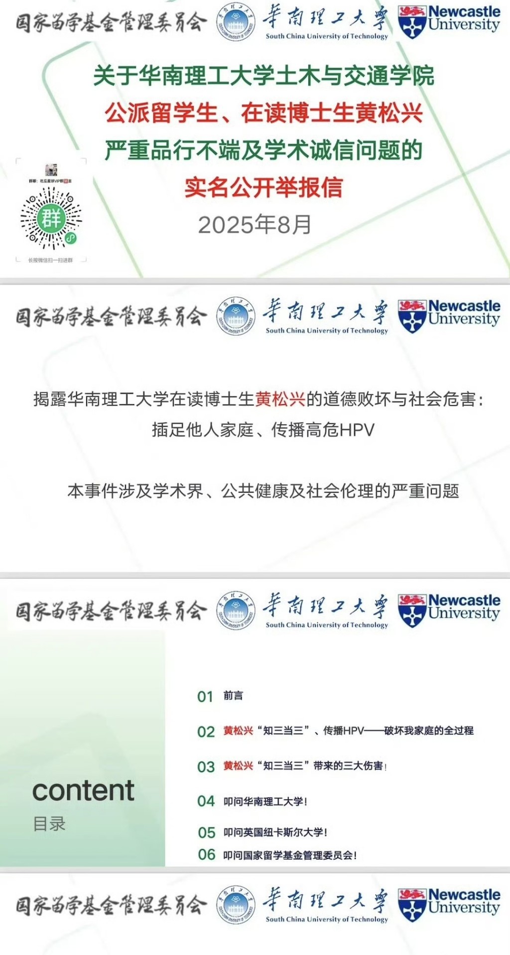 36歲的舉報人張先生接受奔流新聞訪問時表示,自己居于杭州,為支持妻子留學曾賣房籌措60萬元人民幣,未料婚姻遭此背叛。他強調黃某興“在道德層面根本不具備公派留學資格”,并透露已向華南理工大學實名舉報,但因未獲實質回應才決定公開資料。