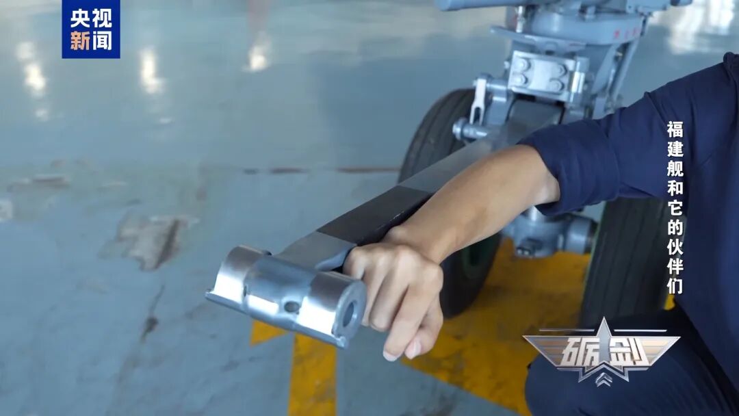 在沈飛的機庫,記者看到兩架殲15-T飛機一前一后停放著,殲-15T的“T”是漢語拼音“tán”的首字母。彈射桿是殲-15T飛機為彈射起飛專門量身制造的。它能直接鉤住航母甲板上的電磁彈射器,瞬間就能把幾十噸重的殲-15T從靜止的狀態加速到幾百公里每小時,拽著戰機沖離甲板。