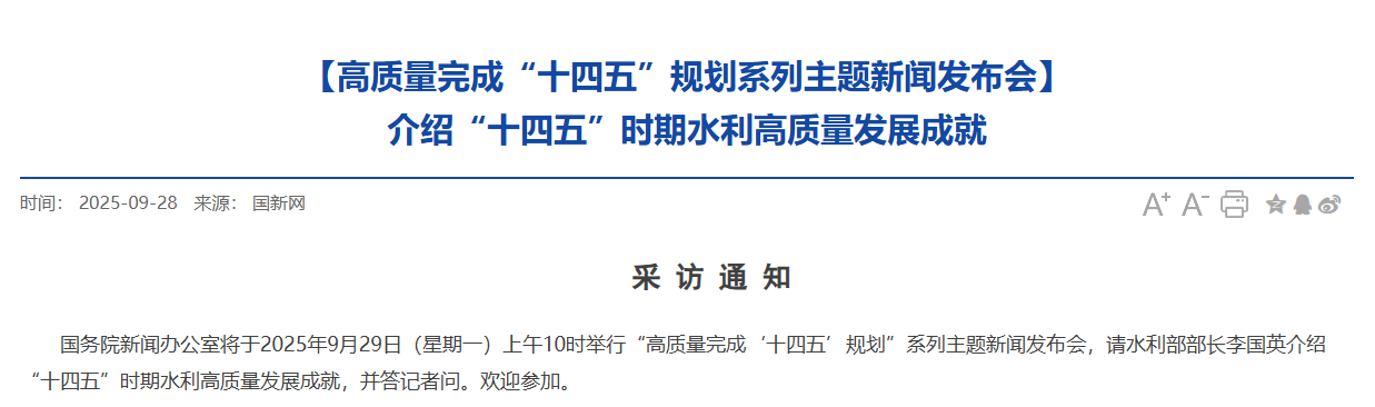 國務院新聞辦公室將于2025年9月29日(星期一)上午10時舉行“高質量完成‘十四五’規劃”系列主題新聞發布會,請水利部部長李國英介紹“十四五”時期水利高質量發展成就,并答記者問。