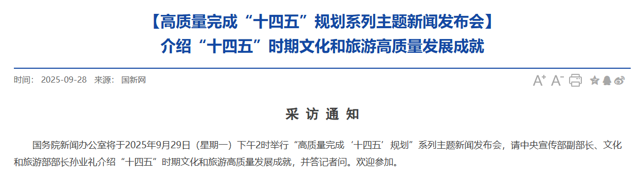 國務院新聞辦公室將于2025年9月29日(星期一)下午2時舉行“高質量完成‘十四五’規劃”系列主題新聞發布會,請中央宣傳部副部長、文化和旅游部部長孫業禮介紹“十四五”時期文化和旅游高質量發展成就,并答記者問。