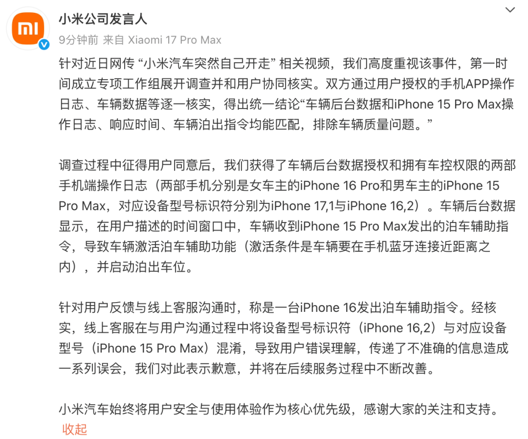 針對近日網傳 “小米汽車突然自己開走” 相關視頻,我們高度重視該事件,第一時間成立專項工作組展開調查并和用戶協同核實。雙方通過用戶授權的手機APP操作日志、車輛數據等逐一核實,得出統一結論“車輛后臺數據和iPhone 15 Pro Max操作日志、響應時間、車輛泊出指令均能匹配,排除車輛質量問題?!?/p>